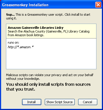 Gainesville library/Amazon script page and click on "Install this script"