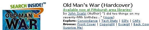 The Amazon Pittsburgh Libraries Linky is a Greasemonkey script that inserts status information from the Allegheny County Library catalog into book listings from Amazon.com.