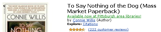 If the book is found in the catalog, this script will tell you whether the book is available, checked out, or on order, and how many other people currently have holds on it. The status line is a direct link to that book's listing in the library catalog, which makes it easy to request a library copy online and have it delivered to your local branch for pickup.